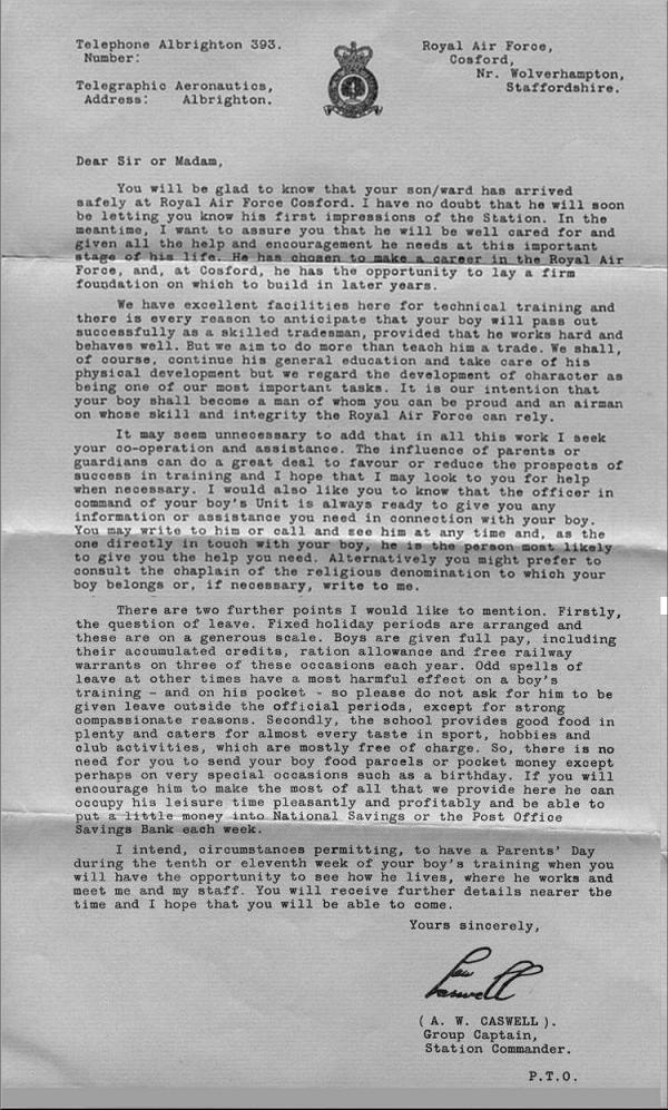 Letter to parents from Grp. Capt. Caswell